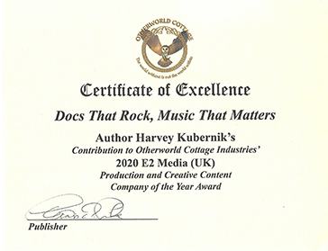 E2 MEDIA ALSO PRESENTED ITS 2020 PRODUCTION AND CREATIVE CONTENT COMPANY OF THE YEAR AWARD TO OTHERWORLD COTTSAGE INDUSTRIES "E2 Media is proud to announce that Otherworld Cottage Industries won our prestigious 2020 Production and Creative Content Company of the Year Award, based in part on the Changelings Return navel and music album, but including reference to Otherworld Cottages publications of Terry Hagertys Last of the San Patricios, and Harvey Kuberniks Docs That Rock, Music That Matters." |