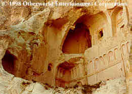 The illusion is that of a ruined building, but it is actually a collapsed sculpture, carved right out of the Cappadocian hillside. It was fast becoming apparent that Trkish locations had much to offer in production value, but what story could unite them? This Macedonian crusader-carved cathedral is historically far more recent than the ancient conflicts of the Hittites and Egyptians, but could be used for a murderous, suspense-filled cat and mouse ambush and chase sequence.