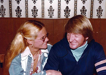 Stunt coordinator and Animal Trainer Monty Cox and his wife, Stunt lady and animal trainer Susan Backlinie celebrate their survival skills at the Wrap party.