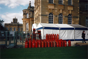 I knew Oxfordshire would be cold in November, especially at night, so heating was a vital concern.The red cannisters in the photo contain propane to power the huge plants installed to heat the marquee and to provide fuel for the mobile kitchen used by The Admirable Crichton to prepare the banquet.The production crews, from construction to operations, were all superb and by noon on this chilly November 1st, despite all the trials and tribulations along the way, everything and everybody was finally ready for the World Premiere Benefit Performance. |