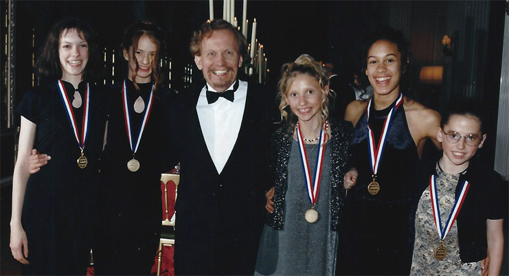 First thing, while my dinner guests were still arriving and getting seated, the photographers took me and the Coventry Rhythm Gymnastics Club talent aside to get a group shot with all their medals. Left to right:  Our wonderful 15-year-old understudy, Debbie Maguire, had to learn all the waif's routines. Even in practice, it is not unusual for rhythmic gymnasts to injure themselves, so Debbie was our lovely insurance policy. Next to Debbie is Rose Meredith, who turned 13 just in time to qualify to be in the show. I'm next, and on the otherside of me is 14-year-old Yvonne Hill, then 13-year-old Aimee Johnson, and at the very end, 10-year-old Hannah Walker. Hannah recently won the under 10 championship, but was too young to be allowed to work in the show. I decided she'd earned her medal learned that in rehearsals, she read my lines for her teammates. I've never met a sweeter group of young ladies, more selfless and supportive, in my life.